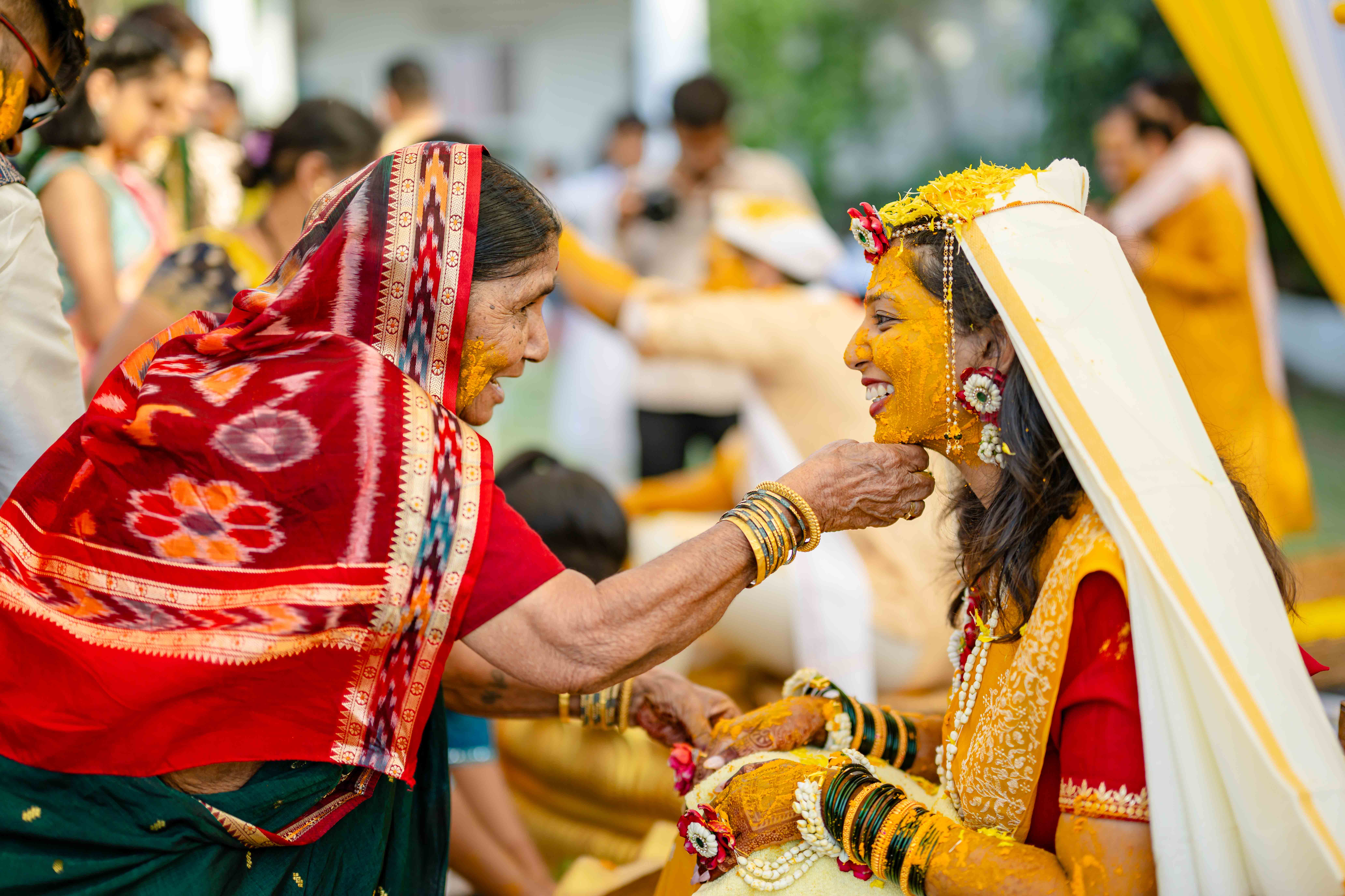 - Haldi Ceremony: Haldi ceremony is a game of laughter, yellow-flavored fun, and a messy, unorganized, and emotional affair which Aniket so subtly brings out with his candid photography.